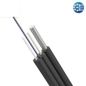 El cable drop FTTH para interiores está estructurado con la fibra óptica posicionada en el núcleo central, acompañada por dos elementos de refuerzo paralelos ubicados en los extremos laterales. La chaqueta exterior está fabricada en poliolefina retardante a la llama, libre de halógenos y de baja emisión de humo (LSZH, por sus siglas en inglés), cumpliendo con los estándares de seguridad en instalaciones interiores.